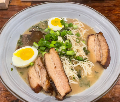 Zutaten Brühe:2-3 Bio Spitzbeine vom Schwein700-800g Bio Knochen vom Schwein(wahlweise kannst du auch 3-4 Gläser fertige Bio Brühe vom Schwein nehmen) 1 große Zwiebel1 Stange Lauch4 Frühlingszwiebeln2 Knoblauchzehen4 cm Ingwer200 g Shitake-Pilze50 ml Sojasauce 3 EL Tahin (Sesampaste)Butter2 l Wasser2...