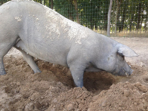 Bio Schwein 445 vom Thießener Landhof liebte es sich im Schlamm zu suhlen und ein kühles Bad zu nehmen. Bei den aktuellen Temperaturen auch genau das Richtige. Wie seine Vorgänge Schwein 443 und 444 wurde es im Juli 2019 geboren und wuchs bei Bauer Sven auf. Am 13. August wurde es dann von den Metzgern auf Gut Hirschaue geschlachtet.