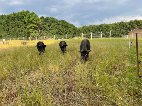 Die Bio Schweine 526-528 waren Märkische Sattelschweine, die ihr ganzes Schweineleben lang in Freiland auf dem Acker von Bauer Henrik auf Gut Hirschaue verbracht haben. Sie wurden am 4. und 6. März bzw. 14. Juni 2020 geboren. Ihr Vater war Schweinsteiger...