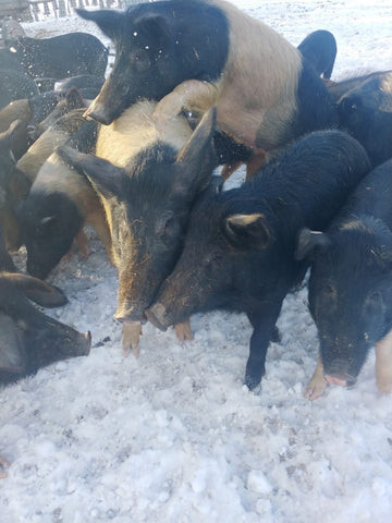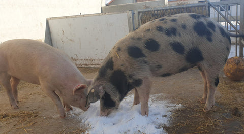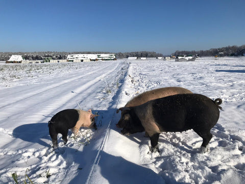 Das sind die beiden Bio Freilandschweine 497 und 498 (oben rechts im Bild) von Bäuerin Anja Koch aus Gömnik. Bei herrlichem Winterwetter zogen sie über den Acker und schnüffelten im Schnee. Denn die Schweine sind ganzjährig draußen und kennen keinen Stall....