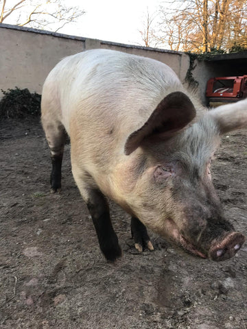 Schwein 349, ein Borg (kastrierter Eber) hat sein Leben auf den Weiden von Gut Hirschaue verbracht. Es ist im Gegensatz zu Schwein 350 kein reinrassiges Sattelschwein, sondern trägt Wildschweingene in sich. Das verdankt es dem Vater: Wildschweineber Schweinsteiger der es...